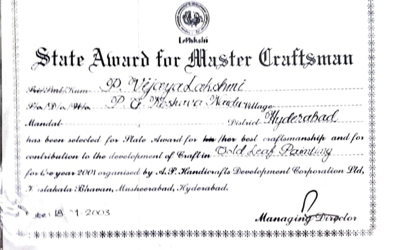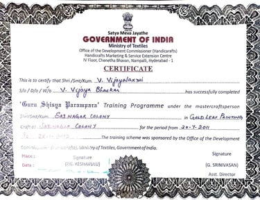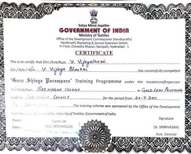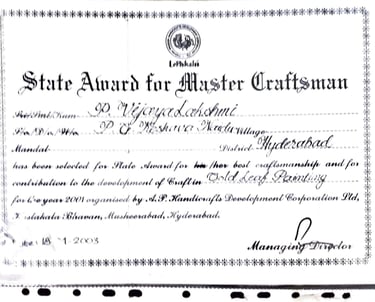 A recipient of the prestigious Lepakshi State Award (2003), she has also served as a certified mentor under the Ministry of Textiles’ Guru–Shishya Parampara Programme, contributing significantly to the preservation and propagation of this sacred art form.